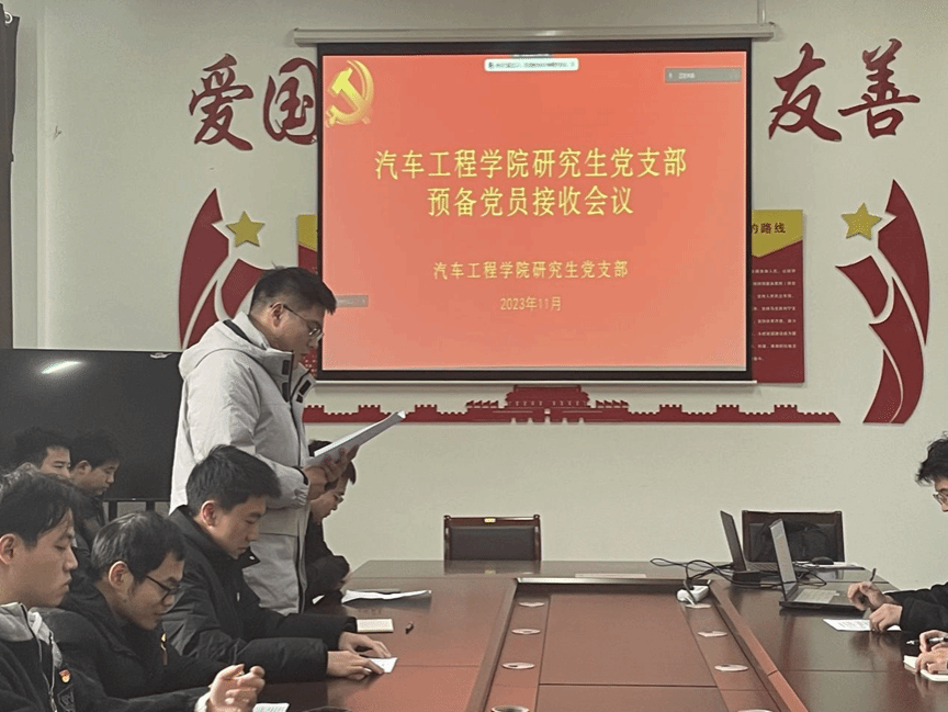 2023年11月29日中午在机械馆A323会议室,汽车学院研究生党支部召开党员大会,讨论预备党员接收的议题,会议由支部宣传委员陈志峰主持,范景森老师及支部全体党员参加。。
