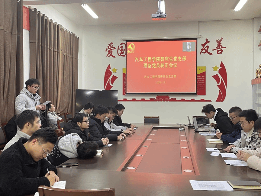2023年11月29日中午于机械馆A323会议室,汽车学院研究生党支部召开党员大会讨论预备党员卢东升同志的转正事宜,会议由陈志峰主持,范景森老师及支部全体党员参加。